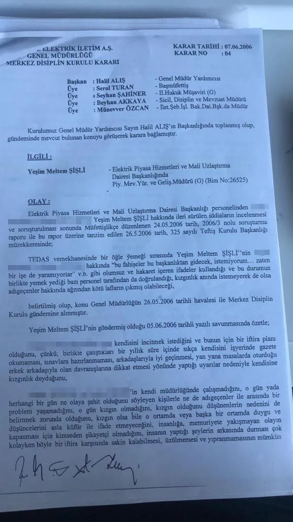 TEİAŞ Merkez Disiplin Kurulu kararında ise; Yeşim Meltem Şişli'nin TEDAŞ yemekhanesinde bir öğle yemeği sırasında L.D ve F.D adlı kadınlar hakkında, "Bu fahişeler bu başkanlıktan gidecek. İstemiyorum. Zaten bir işe de yaramıyorlar" gibi olumsuz ve hakaret içeren ifadeler kullandığı ve bu durumun birlikte yemek yediği bazı personeller tarafından doğrulandığına dikkat çekildi.