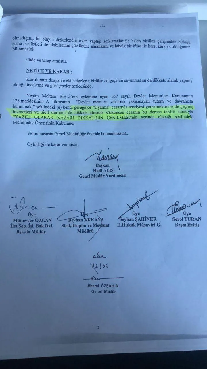 Kararda; "Eyleminize uyan 657 sayılı Devlet Memurları Kanunu'nun 125. maddesinin a fıkrasının c bendi gereğince 'uyarma' cezasıyla tecziyeniz gerekmekte ise de geçmiş hizmetiniz ve sicil durumunuzda dikkate alınarak söz konusu cezanın bir derece tahfifi suretiyle 'yazılı olarak nazari dikkatinizin çekilmesi' Genel Müdürlükçe de 12 Haziran 2006 tarihinde uygun görülmüştür.." denildi.