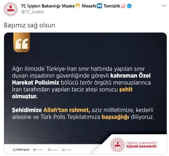 "Ağrı ilimizde Türkiye-İran sınır hattında yapılan sınır duvarı inşaatının güvenliğinde görevli kahraman özel harekat polisimiz bölücü terör örgütü mensuplarınca İran tarafından yapılan taciz ateşi sonucu şehit olmuştur. Şehidimize Allah'tan rahmet, aziz milletimize, kederli ailesine ve Türk Polis Teşkilatımıza başsağlığı diliyoruz."