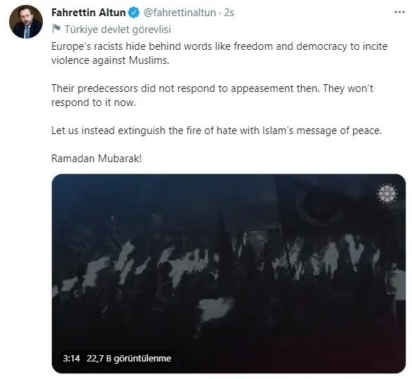 Fahrettin Altun, paylaşımında "Avrupalı ırkçılar 'özgürlük' ve 'demokrasi' gibi kavramların arkasına saklanarak Müslümanlara karşı şiddeti kışkırtıyor. Onlardan öncekiler de mutedillik göstermedi. Onlar da göstermiyor. Körükledikleri bu nefret ateşini İslam'ın barış mesajıyla söndürelim. Hayırlı Ramazanlar." ifadelerini kullandı.