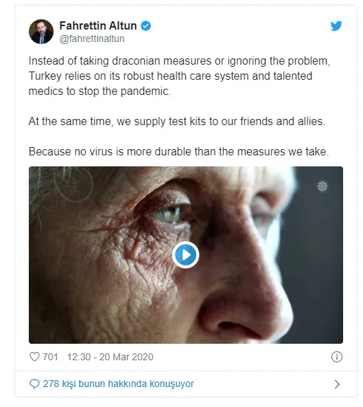 İletişim Başkanı Fahrettin Altun, Türkiye'de koronavirüsle mücadele sürecine ilişkin Twitter hesabından videolu bir paylaşım yaptı.