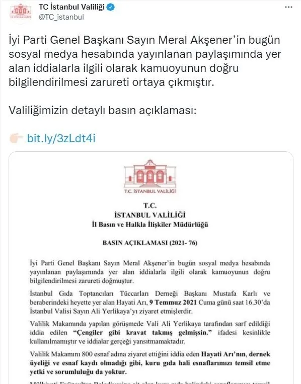 Valilikten yapılan açıklamada, Meral Akşener'in bugün sosyal medya hesabındaki paylaşımında yer alan iddialarla ilgili kamuoyunun doğru bilgilendirilmesi zaruretinin doğduğu belirtildi.