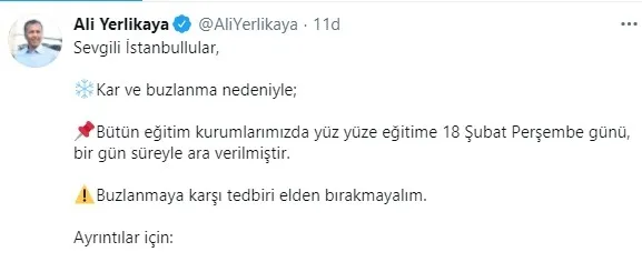 Yerlikaya, "Kar ve buzlanma nedeniyle, bütün eğitim kurumlarımızda yüz yüze eğitime 18 Şubat Perşembe günü, bir gün süreyle ara verilmiştir" açıklamasını yaptı.