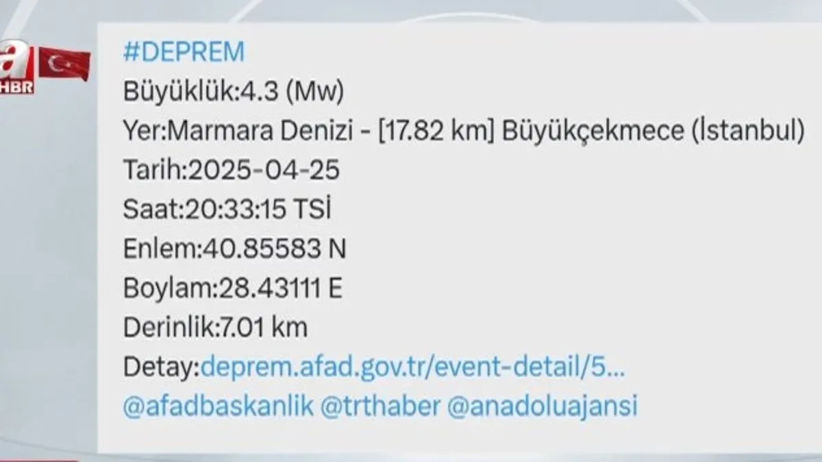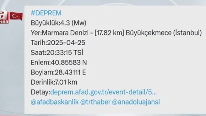 AFAD, İstanbul'un Büyükçekmece ilçesi açıklarında 4.3 büyüklüğünde yeni bir artçı sarsıntının meydana geldiğini bildirdi.