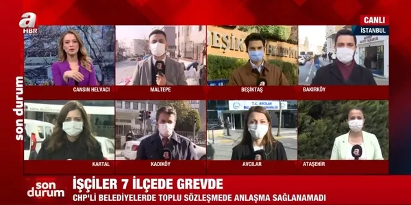 Bakırköy'de yaşanan son durumu ise Mehmet Karataş canlı yayında aktardı. Durumun Bakırköy'den farksız olduğunu ifade eden A Haber muhabiri Karataş, belediye işçilerinin taleplerinin karşılanmaması nedeniyle Bakırköy Özgürlük Meydanı'nın işçilerin grevi nedeniyle hak arama meydanı haline geldiğini söyledi. Karataş, CHP yönetimindeki belediyenin işçilerin hak taleplerine ise kayıtsız kaldığını ifade etti.