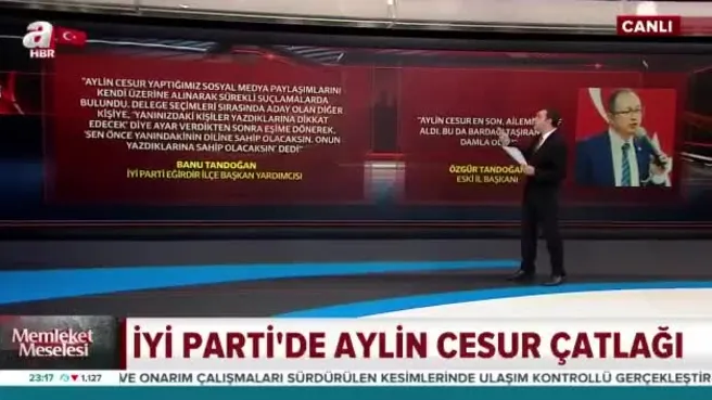 İYİ Parti Eğirdir İlçe Başkan Yardımcısı Banu Tandoğan ise "Aylin Cesur yaptığımız sosyal medya paylaşımlarını kendi üzerine alınarak sürekli suçlamalarda bulundu. Delege seçimleri sırasında aday olan diğer kişiye, 'yanınızdaki kişiler yazdıklarına dikkat edecek' diye ayar verdikten sonra eşime dönerek, 'sen önce yanındaki karının diline sahip olacaksın. Onun yazdıklarına sahip olacaksın' dedi. Ona şu cevabı verdim: Ben bu partinin bir üyesiyim. Eşim de olsa yazdıklarıma, konuştuklarıma yön veremez. Kendinizi benden üstün göremezsiniz!"