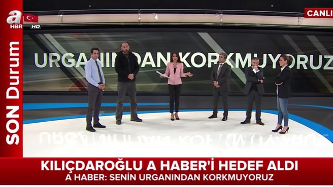 CHP lideri Kemal Kılıçdaroğlu'nun A Haber ve ATV'yi hedef alan skandal sözlerine A Haber çalışanları canlı yayında yanıt verdi. Turkuvaz Medya Grubu çalışanları Duygu Leloğlu, Murat Gener, Kerim Ulak, Tuncay Güven, Emrah Öncül ve Emine Kavasoğlu hakaret ve tehditler savuran Kılıçdaoğlu'na "Biz ölümden korkmuyor" diye yanıt verdi. İşte Kılıçdaroğlu'nun skandal sözlerine Turkuvaz Medya Grubu çalışanlarının yanıtı...