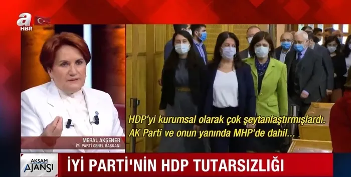 İYİ Parti Genel Başkanı Akşener, HDP'nin terör örgütü PKK ile ilişkisini görmezden gelip Cumhur İttifakı'nı algı operasyonu yapmakla suçladı. Kurduğu cümleler, daha önceki açıklamalarını akıllara getirdi. Tutarsızlıklar halkasına bir yenisini daha ekledi.Daha önce katıldığı programda Akşener'e "HDP'yi nerden konumlandırıyorsunuz?" yöneltimiş Akşener de "HDP'yi PKK'nın yanında konumlandırıyorum" demişti. Bu sözlerin sahibi İYİ Parti Genel Başkanı AK Parti ve MHP'yi algı operasyonu yaparak HDP'yi kurumsal olarak şeytanlaştırdığını söyledi.