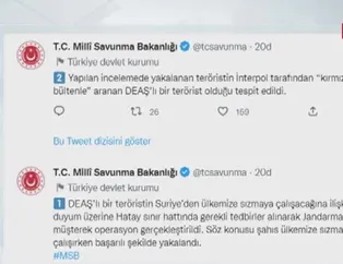 Son dakika haberi... İnterpol tarafından kırmızı bültenle aranan DEAŞ'lı bir terörist Türkiye'ye sızmaya çalışırken Hatay sınır hattında yakalandı. Milli Savunma Bakanlığı tarafından yapılan açıklamada Jandarma ile müşterek operasyon gerçekleştirildiği belirtildi.