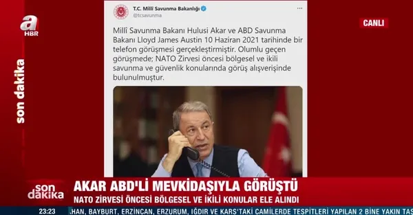 Millî Savunma Bakanı Hulusi Akar ve ABD Savunma Bakanı Lloyd James Austin 10 Haziran 2021 tarihinde bir telefon görüşmesi gerçekleştirmiştir. Olumlu geçen görüşmede; NATO Zirvesi öncesi bölgesel ve ikili savunma ve güvenlik konularında görüş alışverişinde bulunulmuştur. pic.twitter.com/bMmpe4TOtT