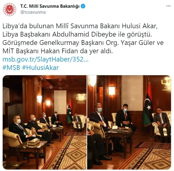 Milli Savunma Bakanı Hulusi Akar, Libya Başbakanı Abdulhamid Dibeybe ile görüştü. Basına kapalı yapılan görüşmede, Genelkurmay Başkanı Orgeneral Yaşar Güler ve MİT Başkanı Hakan Fidan da yer aldı.