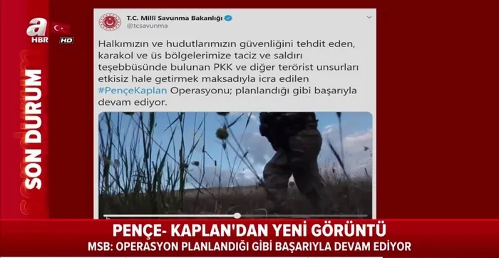 Son dakika haberi; Milli Savunma Bakanlığı sosyal medya hesabı Twitter üzerinden Kuzey Irak'ta sürdürülen Pençe-Kaplan Operasyonu'na ait yeni görüntüler yayınladı.