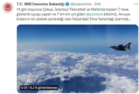 Bakanlıktan yapılan açıklamada, "14 gün boyunca Çekya, İstanbul/Teknofest ve Malta'da toplam 7 hava gösterisi uçuşu yapan ve 7 bin kilometre yol giden SOLOTÜRK ekibimiz, Avrupa kıtasının en yüksek yanardağı olan İtalya'daki Etna Yanardağı üzerinde." ifadelerine yer verildi.