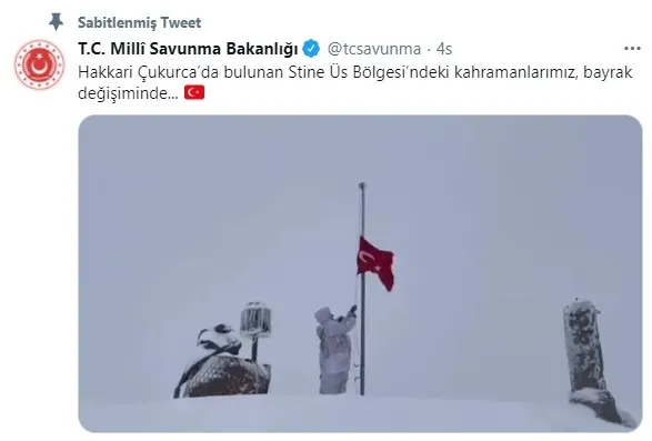 MSB'nin Twitter hesabından, Hakkari Çukurca'da bulunan karla kaplı Stine Üs Bölgesinde askerlerin bayrak değişimi sırasında çekilen videosu paylaşıldı.