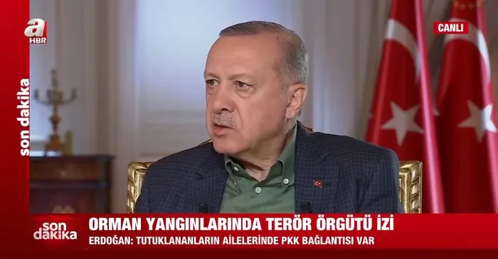 Çankaya Köşkü'nde gerçekleştirilen yayında Başkan Recep Tayyip Erdoğan gündeme ilişkin soruları yanıtladı. Başkan Erdoğan, orman yangınlarında PKK terör örgütüne ait bir iz var mı? sorusuna "Bu endişeyi en başından beri taşıdık. Bunun altından bir şeyler çıktı. Tutuklananların ailesinde PKK ile iltisaklıların da olduğunu tespit ettik. Bütün polis teşkilatımız, istihbaratımız bunun incelemelerini yapıyor. Bizim ciğerlerimiz yanıyor. Ciğerimizi yakanların ciğerini yakacağız. Burada canlılar yandı." ifadelerini kullandı.