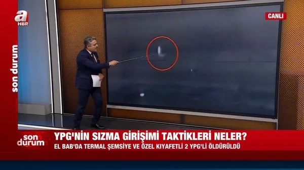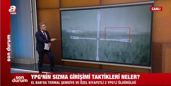 Teröristlerin son dönemde İHA/SİHA'lardan kaçmak için özel kıyafetleri kullandığını ifade eden Ulak, terörden arındırılmış El Bab'a sızma girişiminde bulanan 2 teröristin görüntülerini ilk kez A Haber ekranlarında paylaştı.