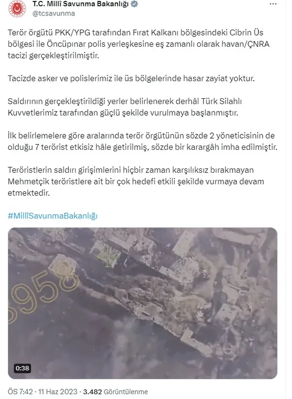 "Terör örgütü PKK/YPG tarafından Fırat Kalkanı bölgesindeki Cibrin Üs bölgesi ile Öncüpınar polis yerleşkesine eş zamanlı olarak havan/çok namlulu roket atar tacizi gerçekleştirilmiştir. Tacizde asker ve polislerimiz ile üs bölgelerinde hasar zayiat yoktur. Saldırının gerçekleştirildiği yerler belirlenerek derhal Türk Silahlı Kuvvetlerimiz tarafından güçlü şekilde vurulmaya başlanmıştır. İlk belirlemelere göre aralarında terör örgütünün sözde 2 yöneticisinin de olduğu 7 terörist etkisiz hale getirilmiş, sözde bir karargah imha edilmiştir. Teröristlerin saldırı girişimlerini hiçbir zaman karşılıksız bırakmayan Mehmetçik, teröristlere ait birçok hedefi etkili şekilde vurmaya devam etmektedir."