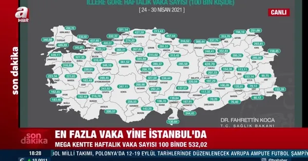 Sağlık Bakanı Fahrettin Koca, 24-30 Nisan arasında illere göre her 100 bin kişide görülen koronavirüs vaka sayılarını açıkladı. Haritaya göre en çok vaka İstanbul'da.