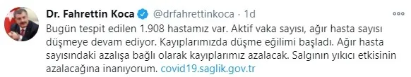 Bakan Koca, "Bugün tespit edilen 1.908 hastamız var. Aktif vaka sayısı, ağır hasta sayısı düşmeye devam ediyor. Kayıplarımızda düşme eğilimi başladı. Ağır hasta sayısındaki azalışa bağlı olarak kayıplarımız azalacak. Salgının yıkıcı etkisinin azalacağına inanıyorum. " dedi.