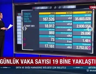Sağlık Bakanlığı covid19.saglik.gov.tr web adresinden Türkiye'nin 17 Mart 2021 tarihine ait koronavirüs tablosunu (Kovid-19) açıkladı.Türkiye'de son 24 saatte 167 bin 526 yeni tip koronavirüs (Kovid-19) testi yapıldı, 18 bin 912 kişinin Kovid-19 testi pozitif çıktı, 73 kişi hayatını kaybetti.