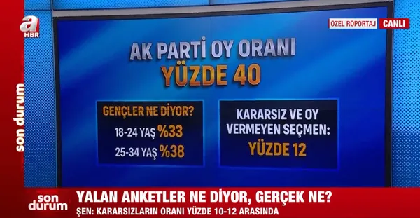 Gençleri AK Parti'yi terk ettiği manipülasyonuna tepki gösteren Şen, "AK Parti'nin gençlerden (18-24) almış aldığı oy oranı, kendisini takip eden diğer partinin 10 puan üzerinde, 25-34 yaş aralığında ise 15 puan üzerindedir. AK Parti baştan beri gençlerin birinci partisidir. Kararsızlar içinde manipülasyon yapılıyor. Kararsızların oy oranı yüzde 10-12'dir." dedi.