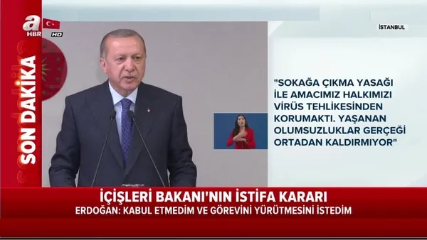 "İstifasını kabul etmeyerek, kendisinden görevini sürdürmesini istedim. Terörle mücadele, tabii afetler sonrası yürütülen çalışmalar ve son olarak koronavirüs salgınında kamu güvenliğini sağlamadaki başarılarına yakinen şahit olduğumuz Bakanımız, görevine devam ediyor."