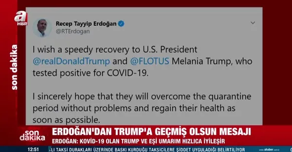 Başkan Erdoğan, Twitter'den İngilizce yaptığı paylaşımda, "Kovid-19 testi pozitif çıkan ABD Başkanı Donald Trump ile First Lady Melania Trump'a geçmiş olsun dileklerimi iletiyor, karantina sürecini sıkıntısız şekilde atlatıp bir an önce sağlıklarına kavuşmalarını temenni ediyorum." ifadelerini kullandı.