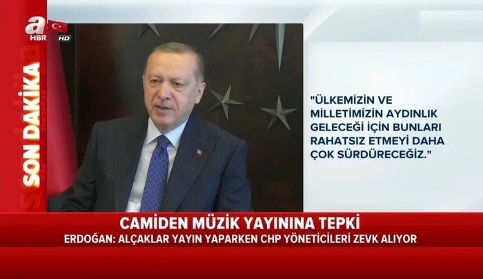 Son dakika haberi; AK Parti Genişletilmiş İl Başkanları Toplantısı öncesinde video konferans yöntemiyle il başkanlarına hitap eden Başkan Recep Tayyip Erdoğan, İzmir'de camiden yapılan müzik yayını provokasyonuna tepki gösterdi. Başkan Erdoğan, "Alçaklar yayın yaparken CHP yöneticileri paylaşım yaptı" ifadelerini kullandı.