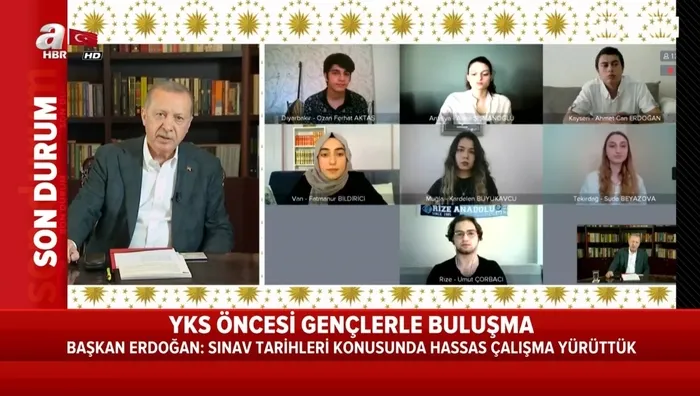 Son dakika haberi; Başkan Recep Tayyip Erdoğan, video konferans yöntemiyle sosyal medyada gençlerle buluştu. Başkan Erdoğan, YKS sınavına girecek olan Muğla'da yaşayan lise öğrencisi Kardelen Büyükavcu'nun 'YKS sınav tarihleri neden değiştirildi?' sorusuna yanıt verdi.