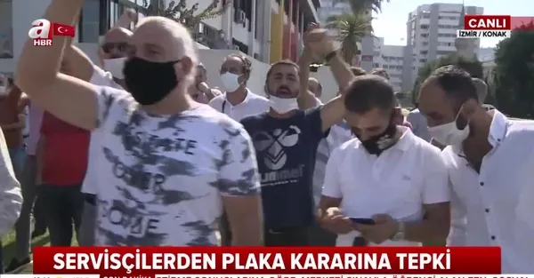 Servisçiler İzmir'de yolu trafiğe kapatarak İzmir Büyükşehir Belediyesi önünde eylem yaptılar. Öfkeli vatandaşlar "İhaleye hayır, plakaya hayır" diye slogan attı.