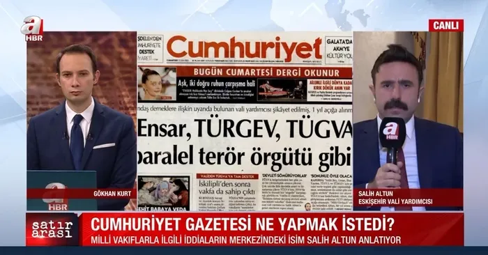 Son dakika haberi: Cumhuriyet gazetesi vakıfları hedef aldı. Gazetenin birinci sayfasında, "Yandaş derneklere ilişkin uyarıda bulunan vali yardımcısı şikayet edilmiş, 1 yıl açığa alınmış. 'Ensar, TÜRGEV, TÜGVA paralel terör örgütü gibi'" ifadelerine yer verildi. Sözde gazetenin hedefindeki Vali Yardımcısı Salih Altun, A Haber ekranında yayınlanan "Satır Arası" programında bu çirkin iftiraya sert yanıt verdi. Canlı yayında konuşan Altun, "Bu son derece münasebetsizce bir durum, TÜGVA yetkilileriyle de görüştüm, onlar da dava açacak ben de açacağım." dedi.