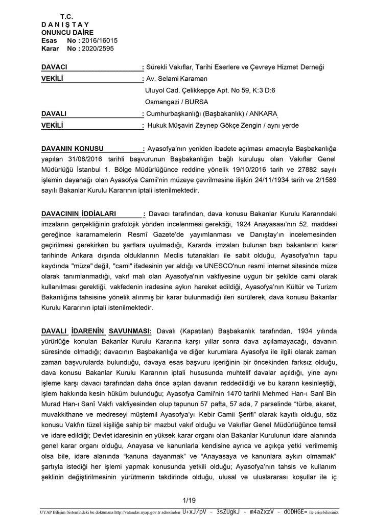 Danıştay 10. Dairesi'nin Ayasofya ile ilgili verdiği kararın ayrıntıları ortaya çıktı. SABAH'ın ulaştığı 2020/2595 no'lu karar tam 19 sayfa… Karar, oy birliği ile 'Sürekli Vakıflar, Tarihi Eserlere ve Çevreye Hizmet Derneği'nin başvurusu üzerine alındı.