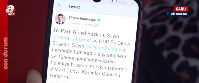 Bugün 8 Mart Dünya Emekçi Kadınlar Günü... Diyarbakır annelerini bir kere daha saygıyla hatırlayıp hatırlatıyoruz. Yıllarca tabiri caizse bölgenin kanını emen terör örgütü PKK'nın pençelerini o topraklardan sökmeye yemin etmiş cesur anneler, cesur kadınlar onlar. O anneler A Haber canlı yayınında İstanbul Büyükşehir Belediye Başkanı Ekrem İmamoğlu'na sert tepki gösterdi. Detayları A Haber muhabiri Sinan Yılmaz aktardı.