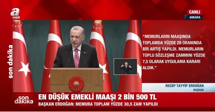 Başkan Recep Tayyip Erdoğan, 3 saat süren Kabine toplantısının ardından canlı yayında flaş açıklamalarda bulundu. Başkan Erdoğan, "Aylık geliri 1500 liradan başlayan 1 milyon 266 bin emeklimizin maaşlarını 2 bin 500 liraya yükseltmiş oluyoruz. Hiçbir emeklimiz 2 bin 500 liranın altında maaş almayacak" ifadelerini kullandı.