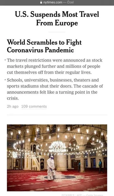 BBC ve New York Times, "Avrupa'ya seyahat yasağı" haberini, uçuş yasağı listesine dahil olmayan Türkiye'nin fotoğraflarıyla verdi.