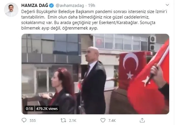 AK Parti Genel Başkan Yardımcısı ve İzmir Milletvekili Hamza Dağ, Soyer'i sosyal medyadan eleştirdi. 23 Nisan Ulusal Egemenlik ve Çocuk Bayramı'nda marşlar söyleyerek eşi Neptün Soyer ile kentin sokak ve caddelerini dolaşan Başkan Tunç Soyer'in "Neredeyiz?" sorusuna tepki gösteren Dağ, sosyal medya hesabı Twitter üzerinden yaptığı paylaşımda şu ifadelere yer verdi: "Değerli Büyükşehir Belediye Başkanım pandemi sonrası isterseniz size İzmir'i tanıtabilirim. Emin olun daha bilmediğiniz nice güzel caddelerimiz, sokaklarımız var. Bu arada geçtiğiniz yer Eserkent/Karabağlar. Sonuçta bilmemek ayıp değil, öğrenmemek ayıp."
