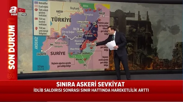 Suriye'nin İdlib kentindeki gözlem noktalarına son bir hafta içerisinde Esad rejim unsurları tarafından iki kez saldırı yapılmıştı. Dün gerçekleştirilen son saldırıda 5 askerimiz şehit olmuştu. Saldırı sonrası Türk Silahlı Kuvvetleri bölgeye yoğun askeri teçhizat ve komanda sevkiyatı gerçekleştirdi. A Haber Yurt Haberler Müdürü Kerim Ulak, sıcak bölgedeki son durumu canlı yayında aktardı. Ulak, kahraman Türk askerinin Esad rejim unsurlarının saldırısına misliyle karşılık verildiğini ve 200'e yakın rejim unsurunun etkisiz hale getirildiğini ifade etti.