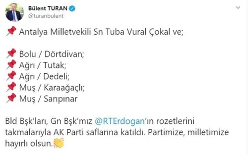 AK Parti Grup Başkan Vekili Bülent Turan sosyal medya hesabından yaptığı açıklamada "Antalya Milletvekili Sn Tuba Vural Çokal ve; Bolu / Dörtdivan; Ağrı / Tutak; Ağrı / Dedeli; Muş / Karaağaçlı; Muş / Sarıpınar Bld Bşk'ları, Gn Bşk'mız @RTErdogan'ın rozetlerini takmalarıyla AK Parti saflarına katıldı. Partimize, milletimize hayırlı olsun." ifadelerini kullandı.
