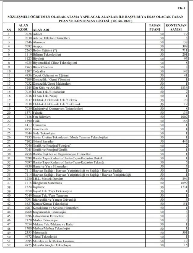 Milli Eğitim Bakanlığı'nın resmi sitesinden yapılan açıklamada, öğretmen adayları için kontenjan sayıları da yer aldı. İşte 20 bin sözleşmeli öğretmen ataması için açılan kontenjanlar: