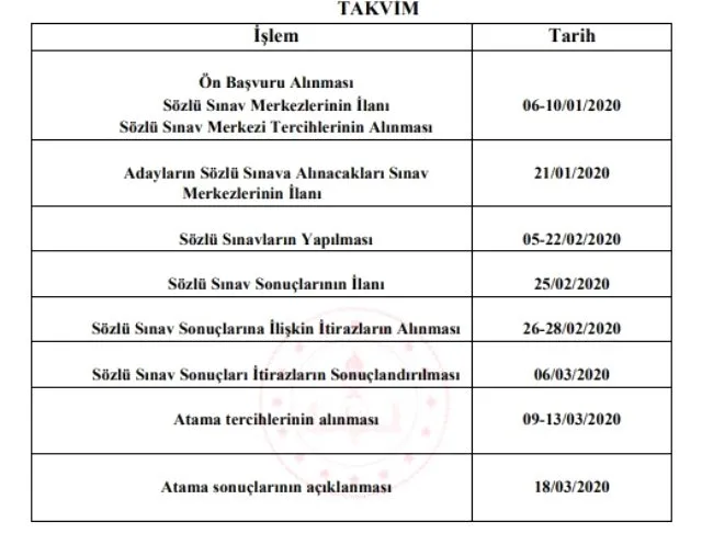 Başvurular 06-10 Ocak 2020 tarihlerinde başlayacak. 21 Ocak tarihinde ise adayların sınava gireceği merkezler belli olacak. 5-22 Şubat tarihleri arasında sözlü sınav mülakatı gerçekleştirilecek, sınav sonuçları ise 25 Şubat'ta açıklanacak. Sınavı kazanan adaylar, 9-13 Mart tarihlerinde tercih yapabilecekler. Tercih sonuçları ise 18 Mart tarihinde Milli Eğitim Bakanlığı tarafından duyurulacak.