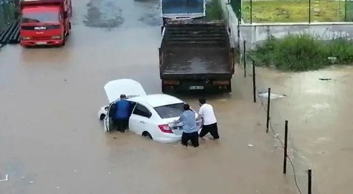 Şiddetli yağışın etkilediği Pazar ilçesinde de su taşkınları nedeniyle bazı araçlar su altında kaldı, çok sayıda iş yerini su bastı.