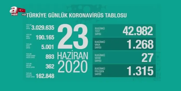 Son dakika haberi; Sağlık Bakanı Fahrettin Koca 23 Haziran Salı gününe ait koronavirüs tablosunu sosyal medya hesabı Twitter üzerinden paylaştı. Bakan Koca bugün 42.982 test yapıldığını bunlardan 1.268 kişide pozitif yeni vaka tespit edildiğini duyurdu. 27 kişinin vefat etmesiyle birlikte pandeminin başından bu yana toplam hayatını kaybeden vatandaşlarımızın sayısı 5.001'e yükseldi.