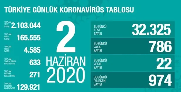 Bakanlığın internet sitesinde yer alan ve Sağlık Bakanı Fahrettin Koca'nın da Twitter'dan paylaştığı "Türkiye Günlük Koronavirüs Tablosu"nun güncel verilerine göre, bugün 32 bin 325 test yapıldı, 786 kişiye Kovid-19 tanısı konuldu.