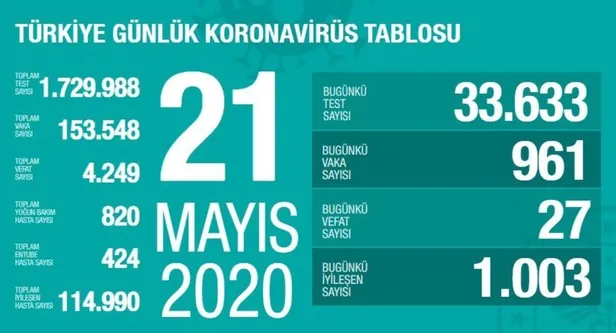 Son 24 saatte 27 hasta vefat etti, 1003 hasta iyileşti. Toplam test sayısı 1 milyon 729 bin 988, vaka sayısı 153 bin 548 ve vefat sayısı 4 bin 249 oldu.