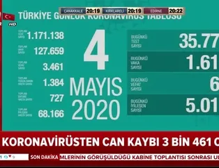 Son 24 saatte 64 hasta vefat etti, 5 bin 15 hasta iyileşti. Toplam test sayısı 1 milyon 171 bin 138, toplam vaka sayısı 127 bin 659, toplam vefat sayısı 3 bin 461 oldu.