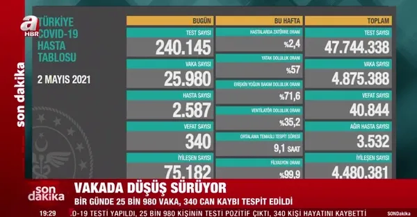 Ülkemizdeki koronavirüs vaka sayılarındaki düşüş sürüyor. 2 Mayıs Pazar günü açıklanan 24 saatlik verilere göre; 2587'si semptomatik olmak üzere 25 bin 980 yeni vaka tespit edildi. Böylece toplam vaka sayısı 4 milyon 875 bin 388'e yükseldi. Vefat sayısı 340 olarak kayıtlara geçti. İyileşen sayısı ise bugün 75 bin 182 oldu. Son dakika gelişmesinin detayları haberimizde...