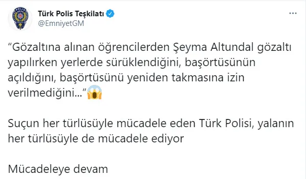 Olaylarda gözaltına alındığı sırada sözde yerde sürüklendiğini, başörtüsünün açıldığını ve başörtüsünü yeniden takmasına izin verilmediğini iftirasını atan öğrenci Şeyma Altundal'ın yalanı ortaya çıktı. Emniyet, Altundal'ın gözaltına alındığı anları sosyal medya hesabından paylaştı. Paylaşımda "Gözaltına alınan öğrencilerden Şeyma Altundal gözaltı yapılırken yerlerde sürüklendiğini, başörtüsünün açıldığını, başörtüsünü yeniden takmasına izin verilmediğini..." Suçun her türlüsüyle mücadele eden Türk Polisi, yalanın her türlüsüyle de mücadele ediyor Mücadeleye devam" ifadelerine yer verildi.
