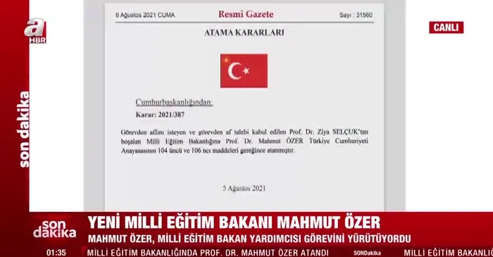Görevden affını isteyen ve af talebi kabul edilen Prof. Dr. Ziya Selçuk'tan boşalan Milli Eğitim Bakanlığına Prof. Dr. Mahmut Özer atandı. Karar Resmi Gazete'de yayımlandı.
