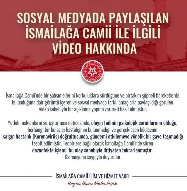 Sosyal medyada yayılan videoya ilişkin İsmailağa Camii İlim ve Hizmet Vakfı'ndan açıklama geldi. Yapılan açıklamada "Yetkili makamların soruşturması neticesinde, olayın failinin psikolojik sorunları olduğu, herhangi bir bulaşıcı hastalığının bulunmadığı ve gerçekleşen hadisenin salgın hastalık (koronavirüs) doğrultusunda, gündemi etkilemeye yönelik bir gaye taşımadığı tespit edilmiştir" denildi.