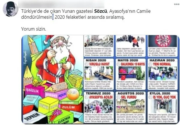 ''2020'den geriye hatırlamak istemeyeceğimiz bu olaylar kaldı'' diyen Sözcü, deprem, çığ ve korona gibi olayları sıraladığı listede Ayasofya'nın ibadete açılmasını da felaket olarak gösterdi.